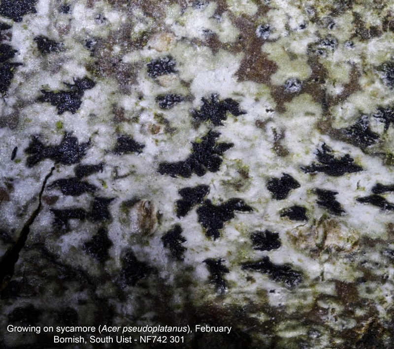 Immersed, pale grey to whitish thallus with black apothecia, variable in shape but usually irregularly stellate. Found on nutrient rich smooth bark and twigs, often on Ash (Fraxinus excelsior)