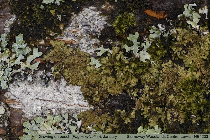 Shiny greenish olive-brown with cylindrical or branched-coralloid isidia which leave a small white scar when rubbed. Widespread and common on trunks and branches of deciduous trees, and fence posts