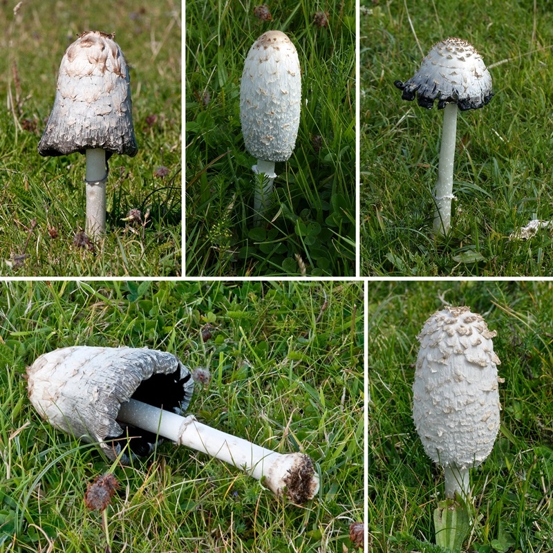 A familiar sight in early autumn, the young fruiting body is white and fibrillose. With age, the fribrils curl to give the shaggy appearance. In time, the gills and lower part of the cap turn black and deliquesce. Stipe smooth with a loose ring. Grows in open areas on a soil substrate
