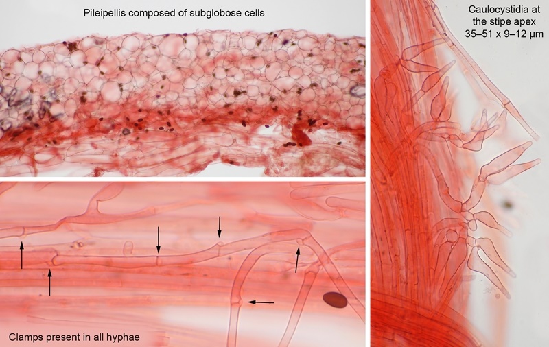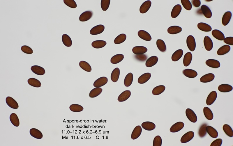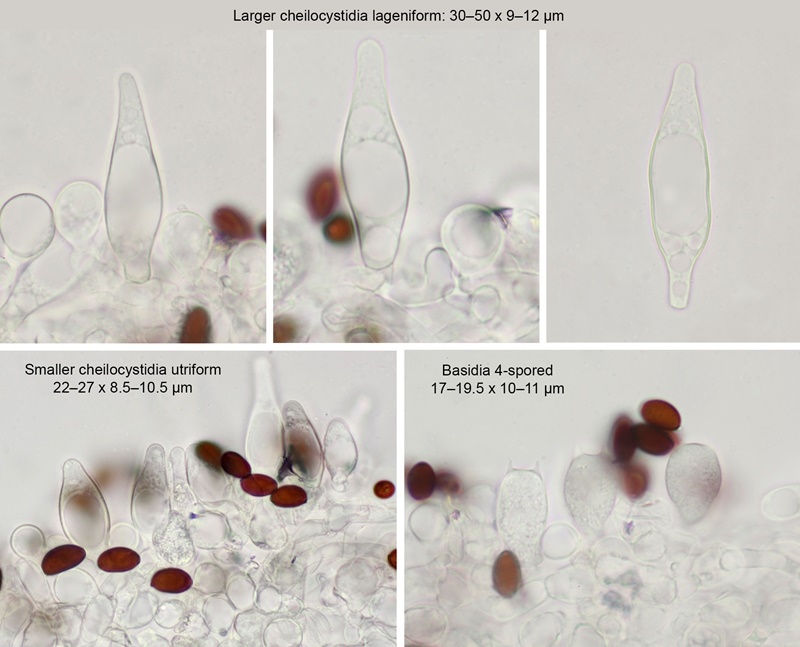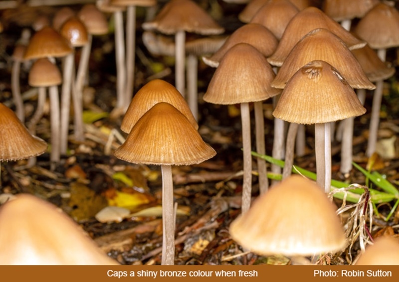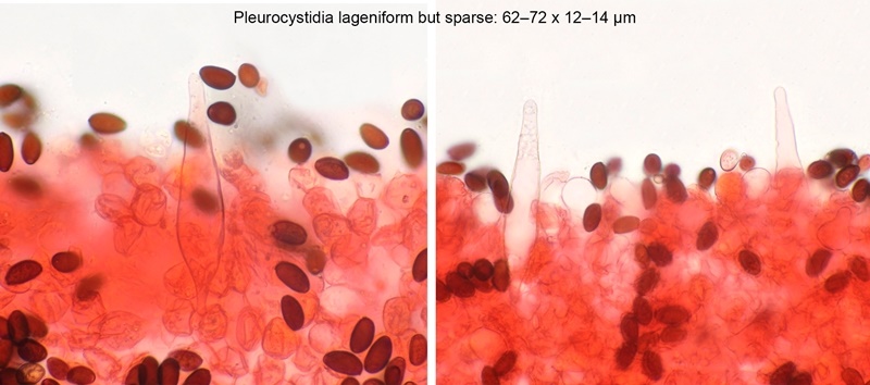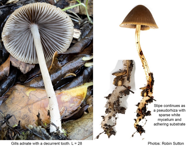 A species of woodland edge and hedgerows, but also found with garden mulch. Most British records are from England and Wales with a few in Scotland. This would appear to be the first Outer Hebridean record. The cap rarely exceeds 35 mm and variable in colour, usually with bronzy-brown in the mix but can also be quite reddish. The gills are adnate with a decurrent tooth. The common name is a little misleading as the reddish gill-edge is often lacking. The stipe is pale with a rooting pseudorhiza. Spores are reddish-brown, and cystidia mainly lageniform in shape. Gill-face cystidia (pleurocystidia) are sparse. Those on the stipe are common especially towards the apex and usually bunched.